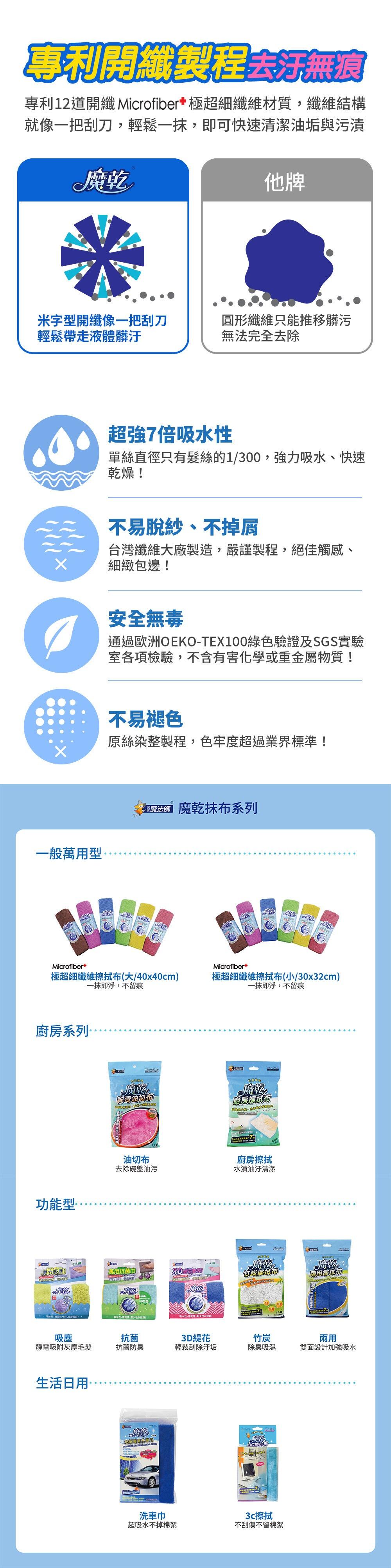 - 專利12道開纖MicroFiber+極超細纖維材質,提供效果顯著之去汙、除垢、吸水及不掉屑特性,完全不同於市售劣質全聚酯纖維商品.