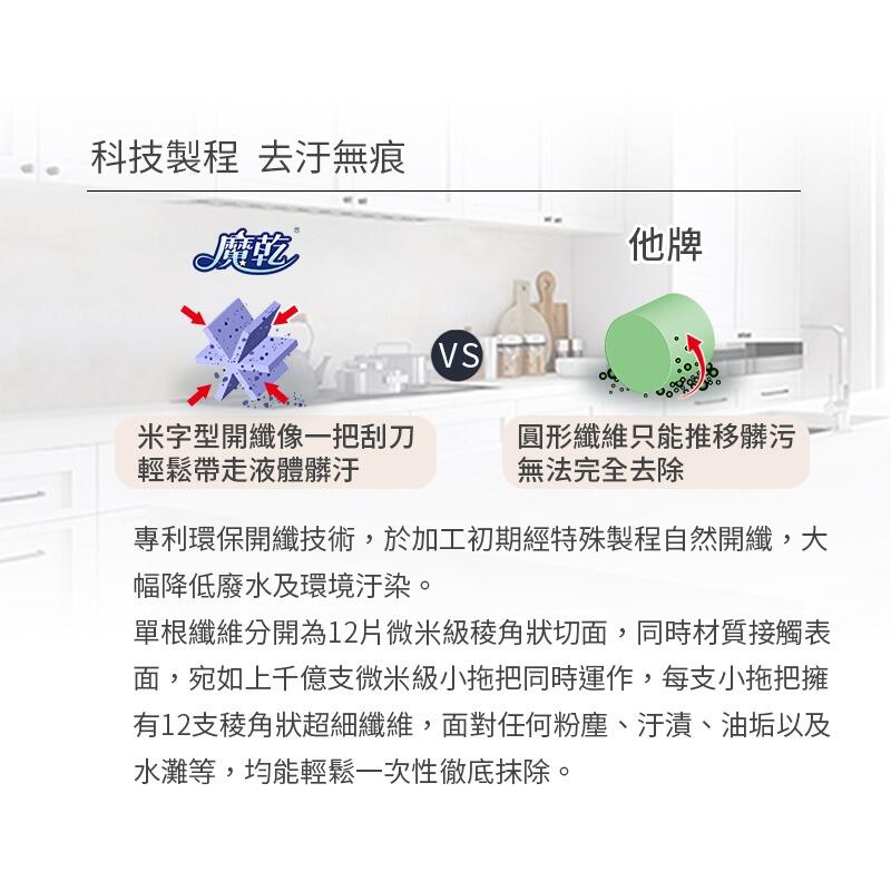 - 纖維直徑只有髮絲1/300,宛如數十億支微米級拖把同時掃除,面對任何大小粉塵、頑強汙漬或黏膩油垢等,輕鬆一次性徹底捕捉抹除.